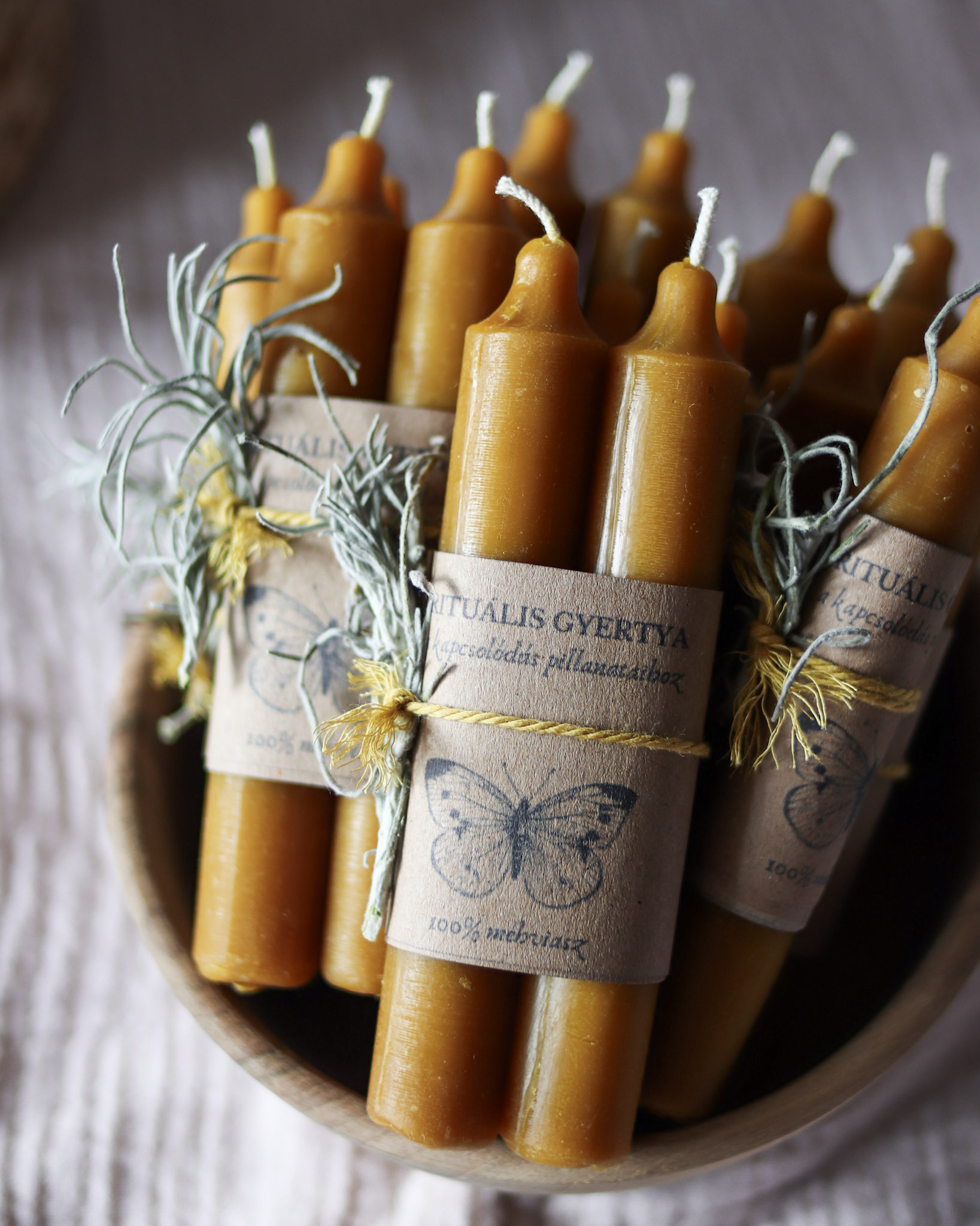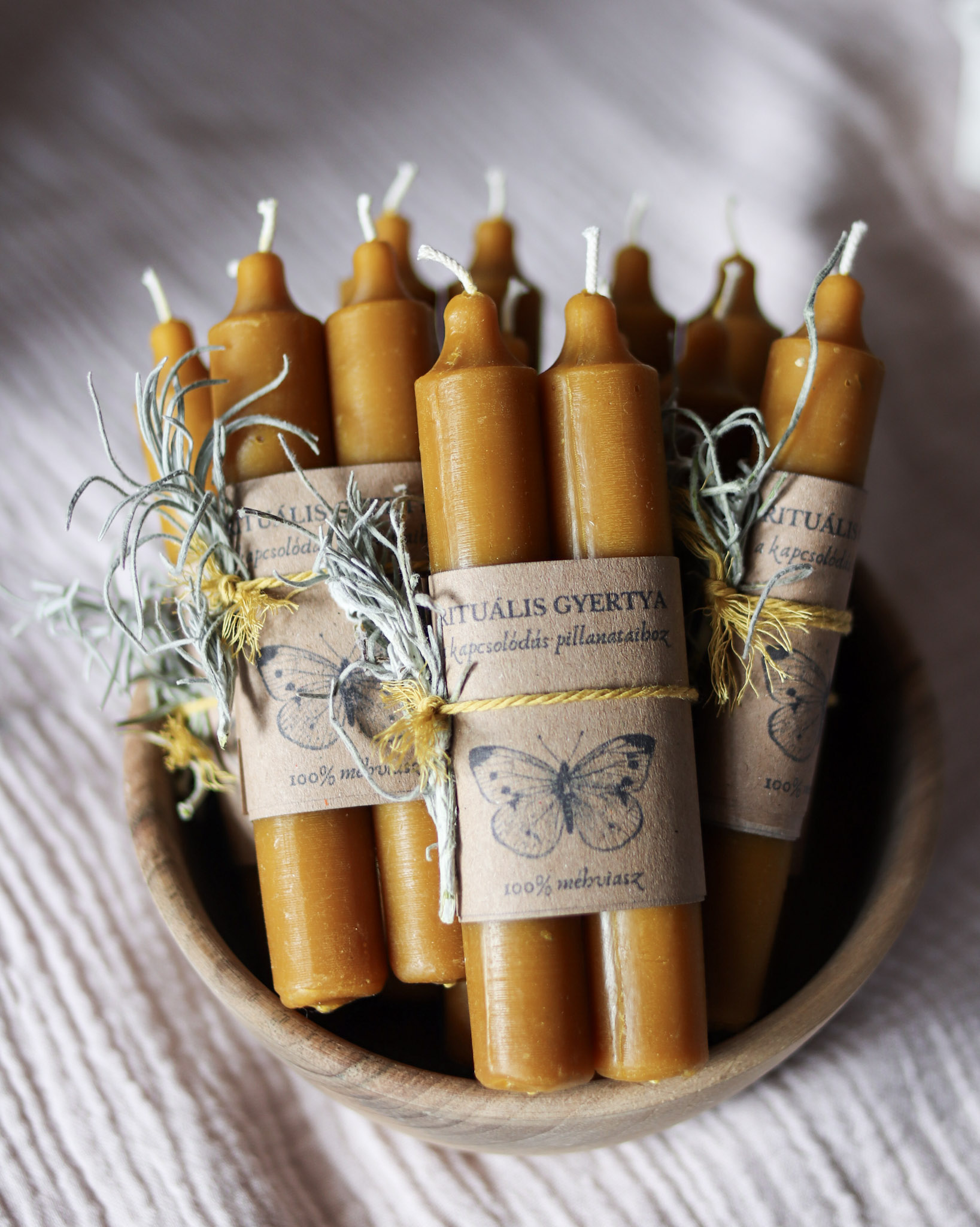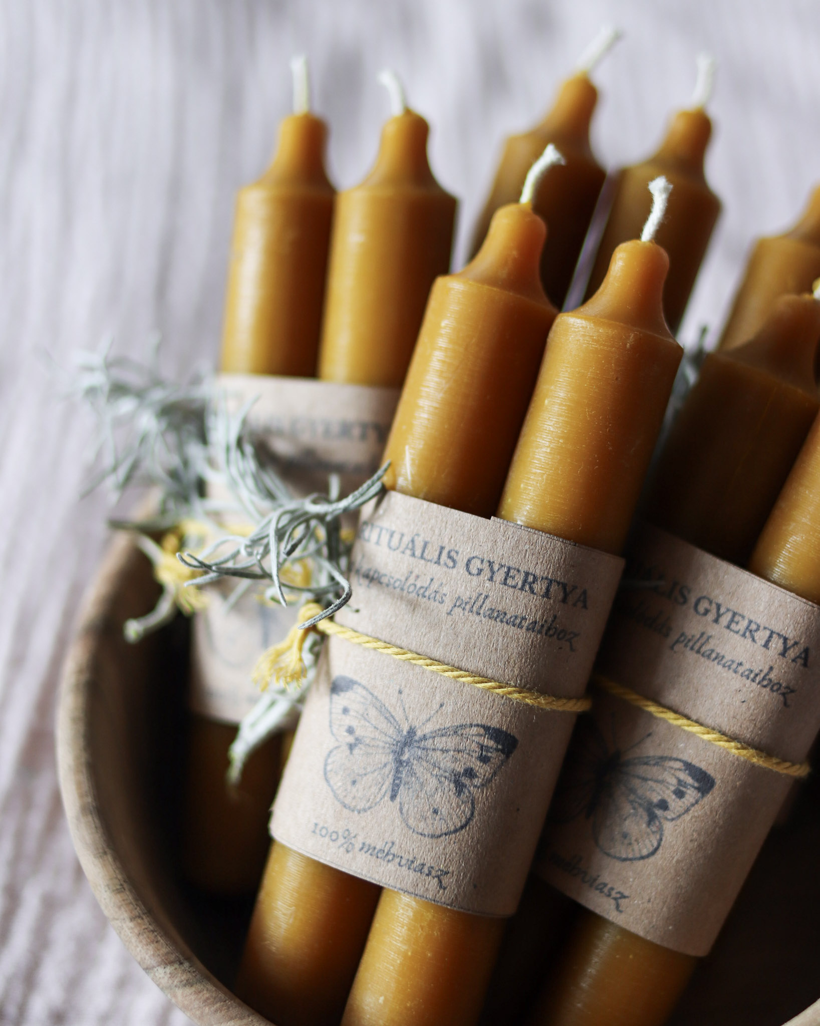 A csomag két darab, kézzel készített méhviasz gyertyát és egy kis útravaló üzenetet tartalmaz (ezt a külső papírcsomagolás alatt találod, ezért óvatosan vedd le a papírszalagokat a gyertyákról).