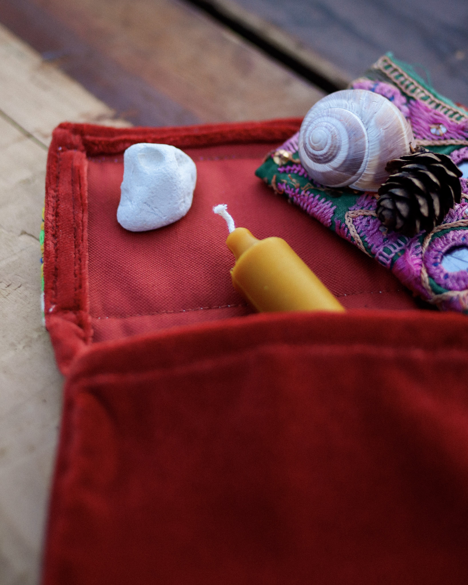 Ez a limitált számban, kézzel készült, textil kincstartó rituális tárgyak, ékszerek vagy apróbb emlékek őrzésére született. Egyszerű formavilágát a díszítésként használt, indiai utazásaim során gyűjtött különleges textilszalagok teszik egyedivé.
